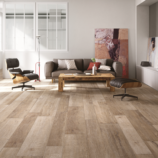 A high-end timber look floor tile suitable for all indoor use, al fresco and covered patio areas. This 14mm thick, rectified matte finish tile is inspired by the wood planks of the Dolomites. Made in Italy.