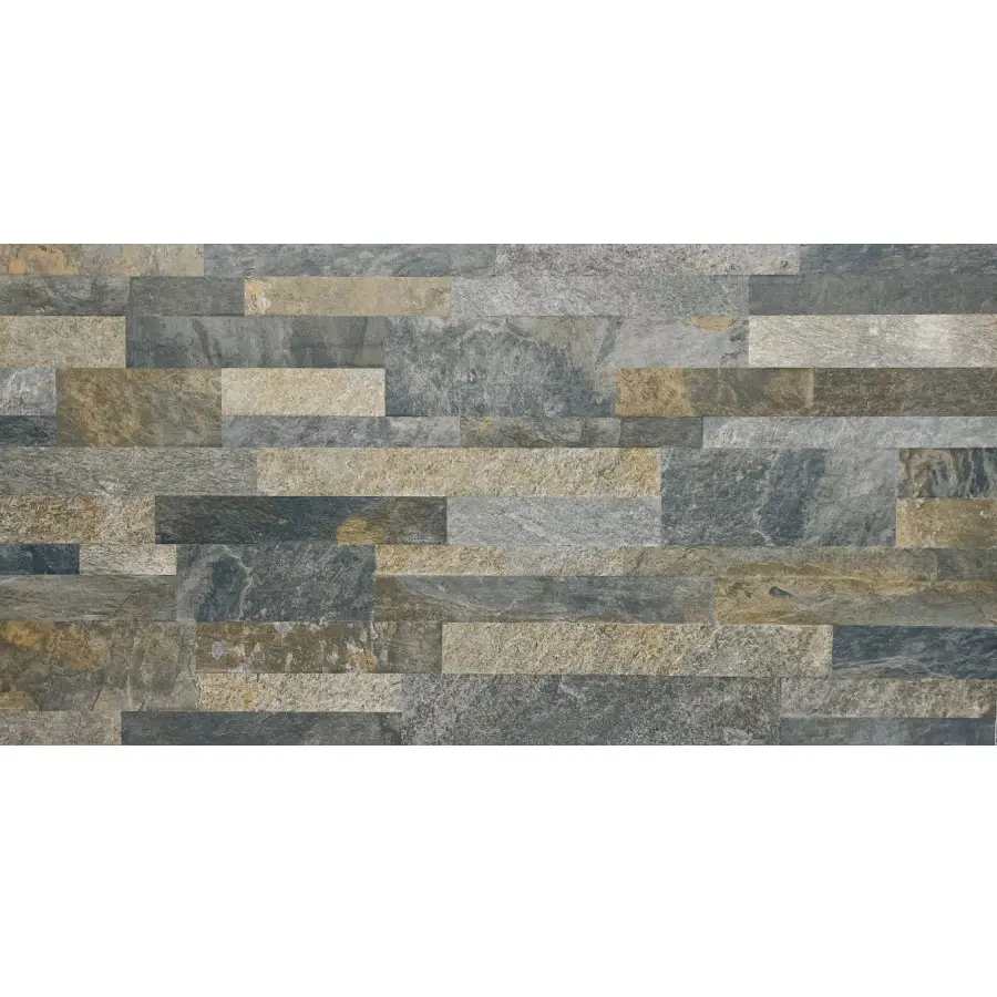A stackstone look porcelain tile in bluestone tones. Looks rough but is actually smooth finish with slight undulation, easy to wipe over and clean. Ideal for any indoor and outdoor feature walls and pillars.